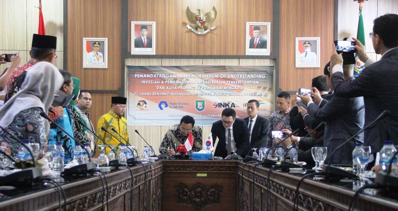 Hal ini semakin diperkuat dengan ditandatanganinya Nota Kesepahaman Antara PT. Trans Rentang Nusantara dengan PT. Pasifik Global Investment tentang Investasi dan Pembangunan Infrastruktur Perkeretaapian Dari Kota Padang Rejang Lebong ke Pulau Baai Kota Bengkulu, di Ruang Rapat Lantai III Kantor Gubernur Bengkulu, Kamis (06/02).