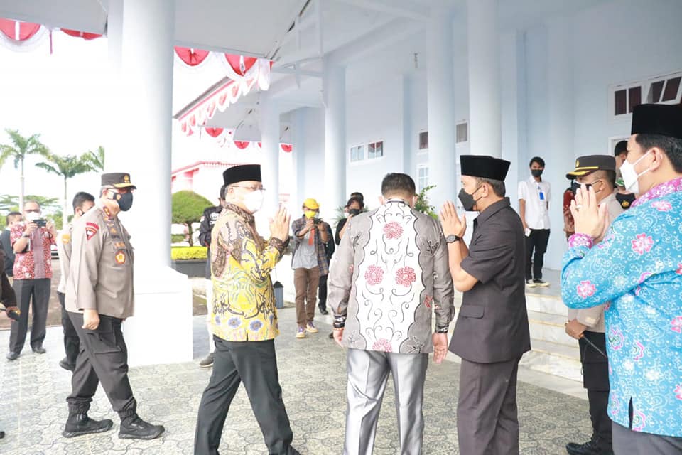 Berandang.com- Bupati Seluma Erwin Octavian, SE. Bersama Sekda Kabupaten Seluma H. Hadianto, SE, MM, M.Si, Forkopimda, dan Pejabat Eselon II di lingkungan Pemerintah Kabupaten Seluma menyambut Gubernur Bengkulu DR. H. Rohidin Mersyah beserta rombongan yang melaksanakan monitoring dan pengawasan PPKM di Kabupaten Seluma, Kamis (5/8/2021) di Gedung Daerah Serasan Seijoan.