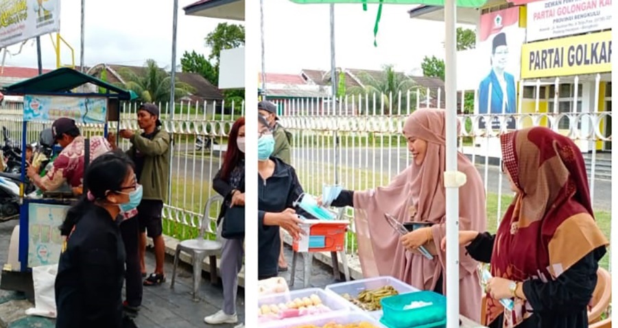 Pembagian masker menyasar warga pengunjung dan penjual makanan di pusat pasar takjil dadakan wilayah kota Bengkulu.