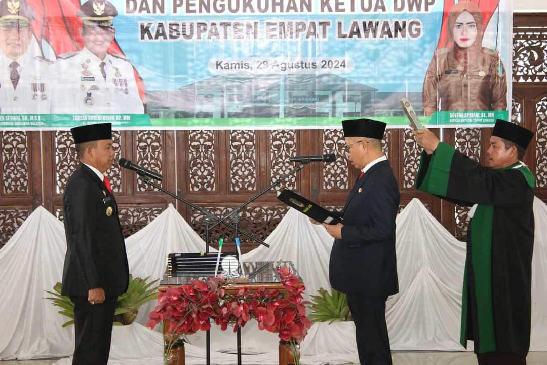 Berandang.com- Empat Lawang, Sumsel. Pelantikan dan Pengambilan Sumpah Jabatan Penjabat (PJ). Sekretaris Daerah dan Pengukuhan Ketua DWP Kabupaten Empat Lawang Oleh Penjabat Bupati Empat Lawang Fauzan Khoiri AP.,MM di Pendopoan Rumah Dinas Bupati Empat Lawang. Kamis, (29/08/2024)