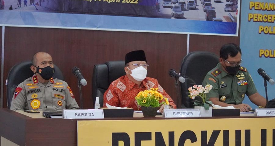 Berandang.com- Gubernur Bengkulu Rohidin Mersyah bersama unsur Forkopimda dan dinas terkait mengikuti video conference Rapat Koordinasi Lintas Sektoral Nasional dalam rangka kesiapan menghadapi idulfitri tahun 2022 di gedung Comand Center Polda Bengkulu pada Kamis 14/04/2022.