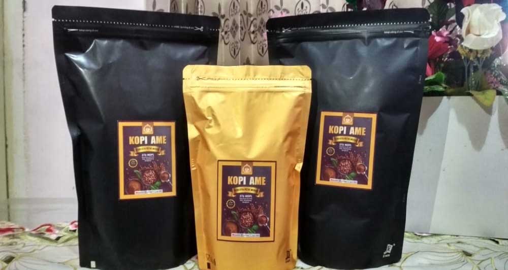 Kopi jenis Robusta ini, dikemas dengan bentuk yang menarik. Kemasan merk Kopi AME dan Bunda QQ ini siap GO Nasional. Dengan di Produksi rumahan oleh pelaku Usaha Mikro Kecil Menengah (UMKM).