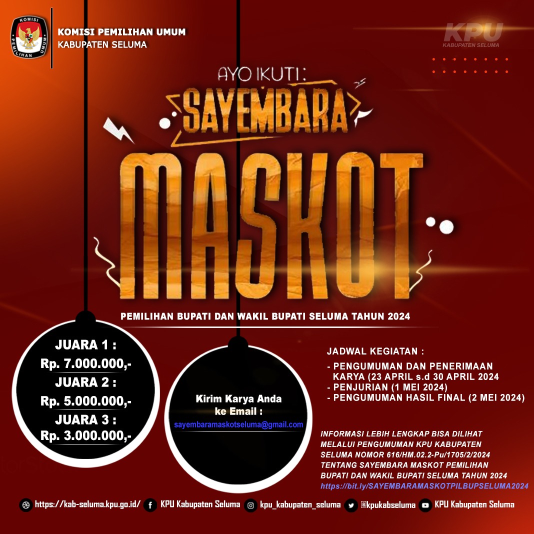 Berandang.com- Komisi Pemilihan Umum (KPU) Kabupaten Seluma membuka sayembara maskot pemilihan Bupati dan Wakil Bupati Seluma Tahun 2024. Bagi yang beruntung menjadi pemenang akan mendapatkan hadiah jutaan rupiah.