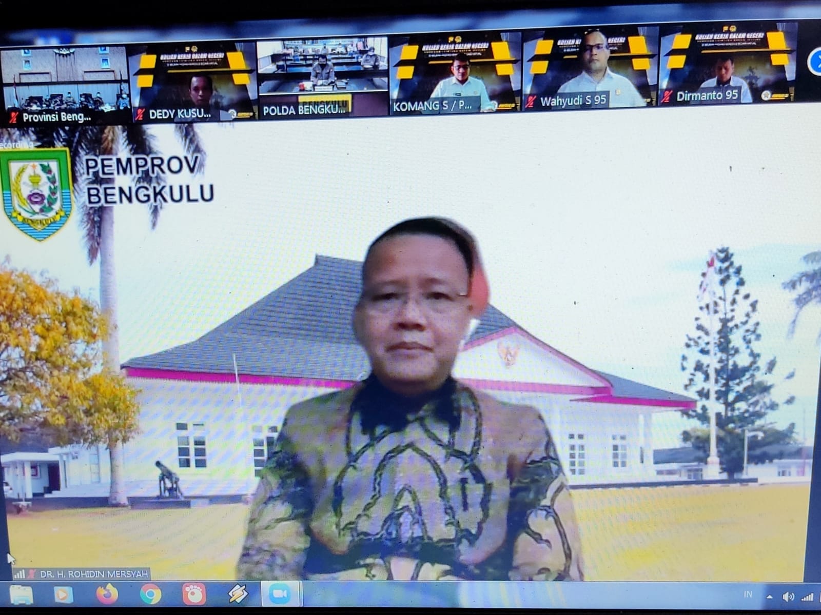 Berandang.com- Pentingnya menerapkan protokol kesehatan (Prokes) COVID-19 kepada masyarakat menjadi hal yang ditekankan Gubernur Bengkulu Rohidin Mersyah saat memberikan materi pada Kegiatan Penelitian Kuliah Kerja Dalam Negeri (KKDN) Peserta Didik Sekolah Staf dan Pimpinan Tinggi (SESPIMTI) Pendidikan Reguler (Dikreg) ke-30 TA. 2021 yang diselenggarakan Polda Bengkulu via virtual, Selasa (3/7/2021).