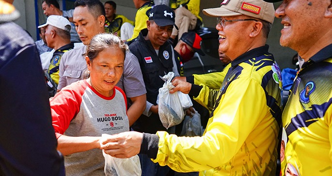 Selain itu juga dilakukan penyerahan bantuan peralatan, sembako kepada masyarakat serta pembagian ikan secara gratis.