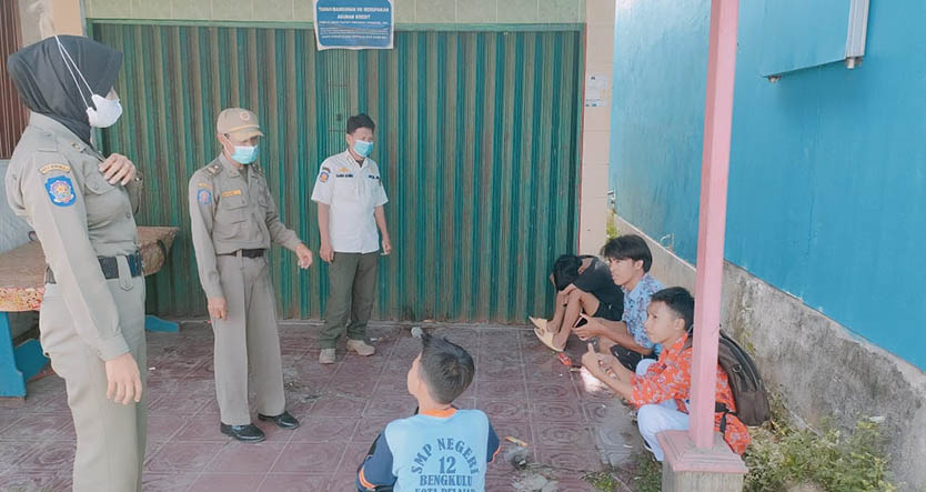 “Banyak ditemukan kerumunan anak-anak sekolah yang tidak menggunakan masker pada saat jam belajar dan sudah kita berikan teguran”, terang personil Satpol PP.