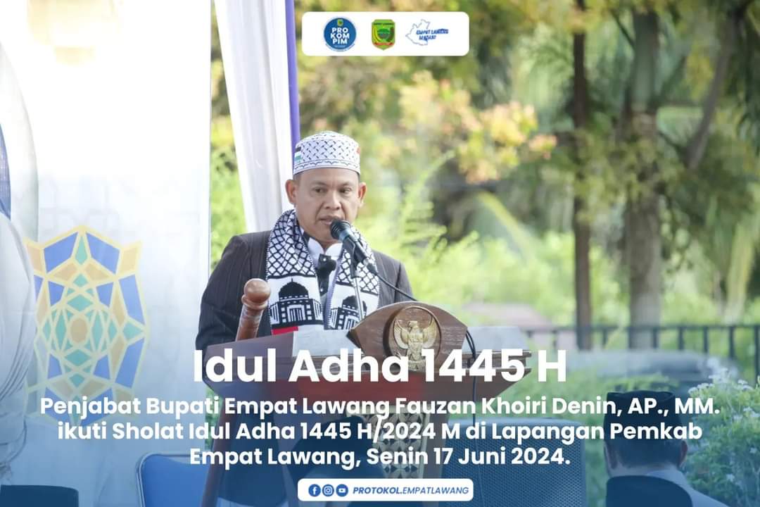 Berandang.com- Empat Lawang, Sumsel – Penjabat Bupati Empat Lawang Fauzan Khoiri Denin, AP., MM. ikuti Sholat Idul Adha 1445 H/2024 M di Lapangan Pemkab Empat Lawang, Senin (17/06/2024)