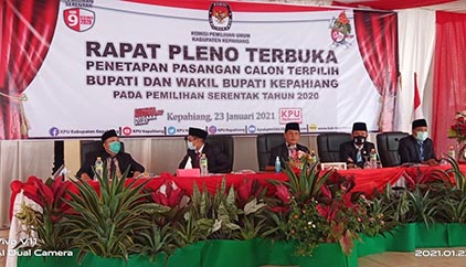 Seperti disampaikan komisioner KPU divisi Hukum dan kawasan Syamsul Komar dihadapan peserta yang hadir saat mengikuti pleno terbuka, Berdasarkan Keputusan KPU Kabupaten Kepahiang nomor : 2/PL.02.6/KPT/1708/KPU-Kab/1/202 tentang penetapan calon terpilih Bupati dan Wakil Bupati Kepahiang periode 2021- 2024 ” Menetapkan pasangan calon Bupati dan Wakil Bupati Kepahiang no urut 2 saudara Dr. Ir. Hidayatullah Sjahid, MM dan H. Zurdi Nata, S.IP dengan memperoleh suara sah sebanyak 49.031 (57,06 persen) dari jumlah seluruh perolehan suara sah pemilihan Bupati dan Wakil Bupati Kabupaten Kepahiang dalam pemilihan serentak tahun 2020 “sampainya.