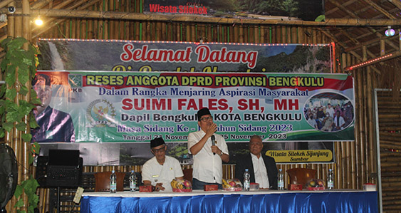Berandang.com- Anggota Dewan Perwakilan Rakyat Daerah (DPRD) Provinsi Bengkulu, Suimi Fales, SH MH menggelar reses penjaringan aspirasi masyarakat. Kegiatan ini berlangsung di Aula Pondok Lesehan Kelurahan Tebeng Kota Bengkulu. Rabu, (22/11/2023)