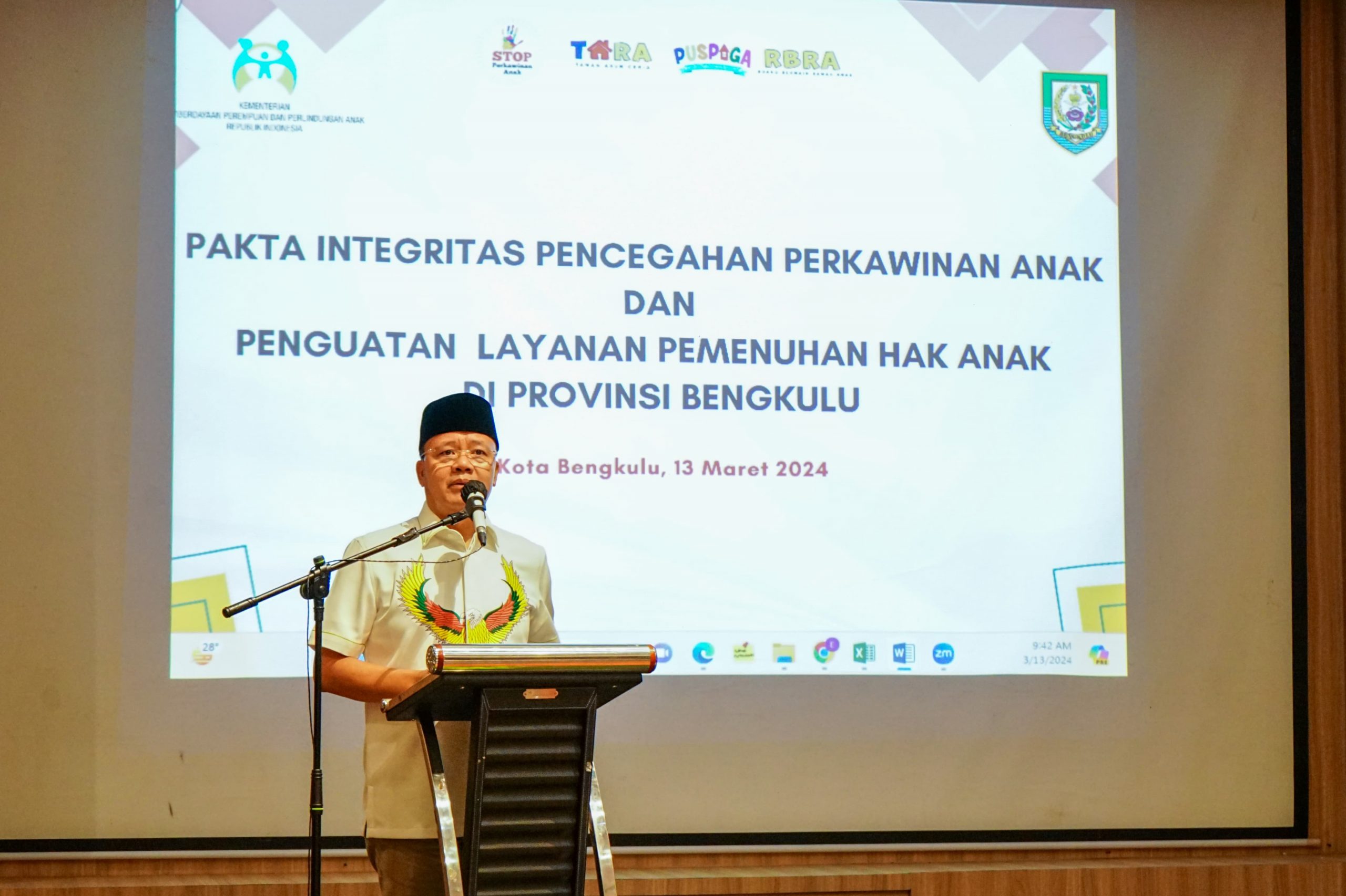 Berandang.com – Gubernur Rohidin Mersyah melakukan Penandatanganan Pakta Integritas dan Penguatan Layanan Pemenuhan Hak Anak di Provinsi Bengkulu didampingi Deputi Bidang Pemenuhan Hak Anak Kementerian Pemberdayaan, Perempuan, Perlindungan, dan Anak (PPPA) Pribudi Arta Nur Sitepu di Hotel Mercure, Rabu (13/11).