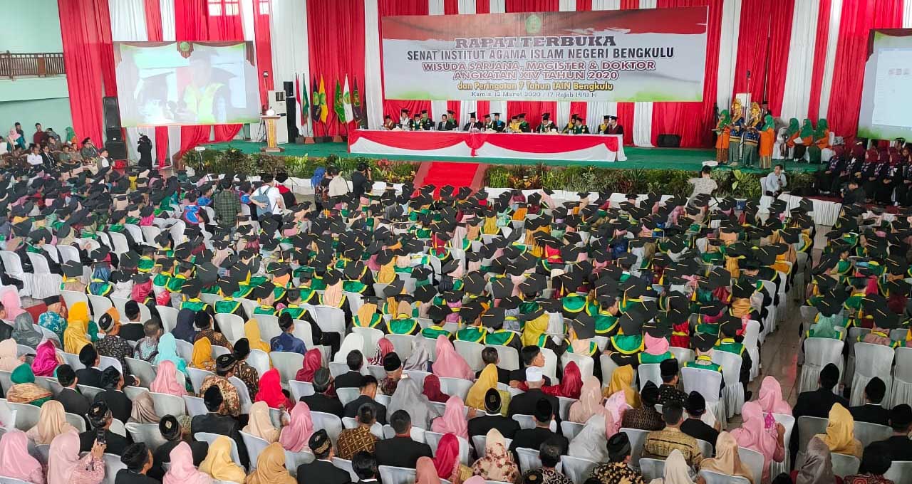 Berandang.com- Bengkulu, Peringatan Institut Agama Islam Negeri (IAIN) Bengkulu ke 7 tahun dan Diwisuda ke XIV tahun 2020, dua Doktor, 9 Magister dan 718 lulusan IAIN Bengkulu diwisuda. Acara wisuda ini digelar di Gedung Gunung Bungkuk eks STQ, jalan Raden Fatah Kota Bengkulu. kamis (12/03/2020).