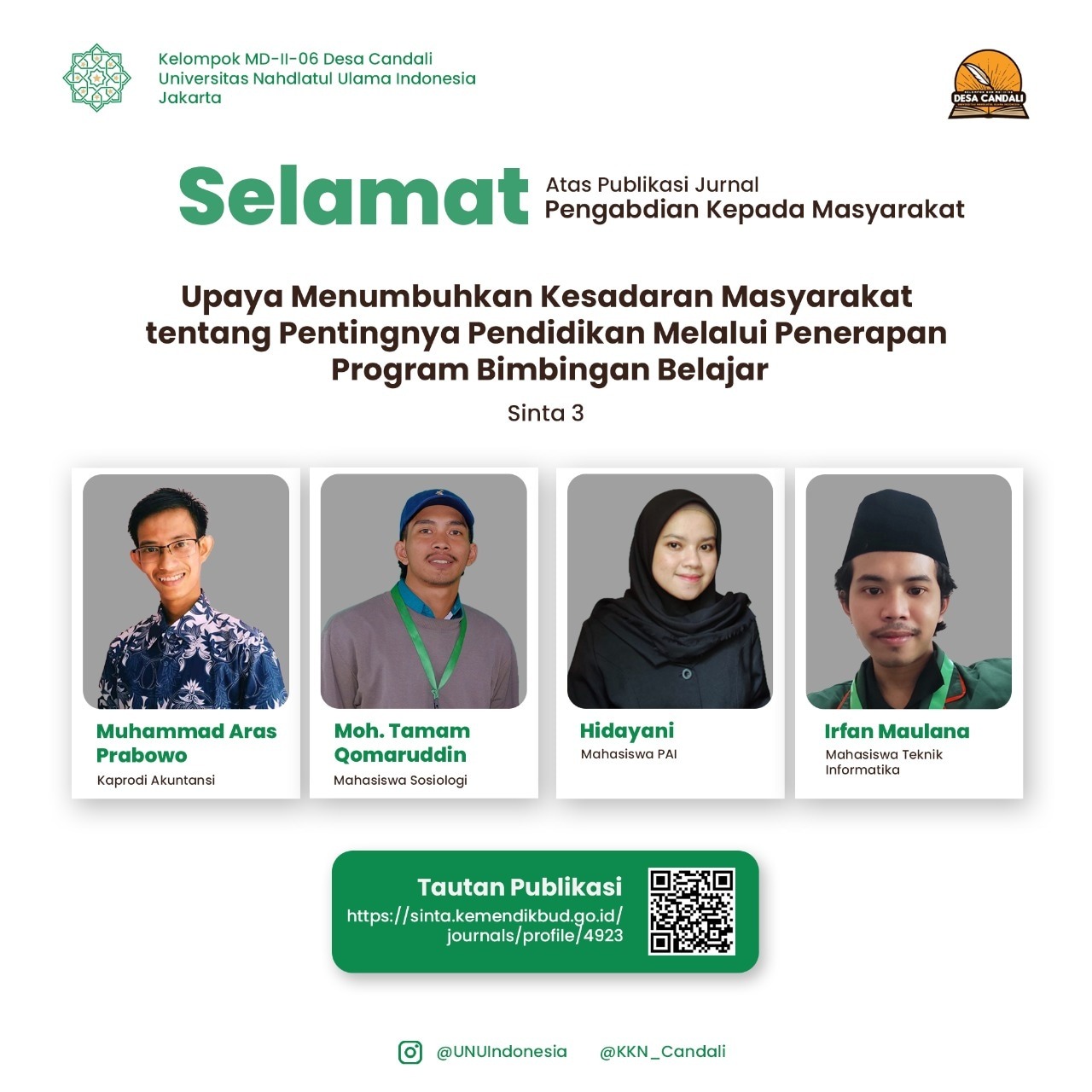 “Kami merasa senang atas terbitnya jurnal kami, tentu itu atas bimbingan Dosen Pembimbing Lapangan (DPL) kami Muhammad Aras Prabowo. Selain itu, kami diberikan insentif oleh Kampus atas jurnal kami, menambah semangat kami dan seluruh mahasiswa Unusia untuk terus berprestasi” ungkap Irfan.