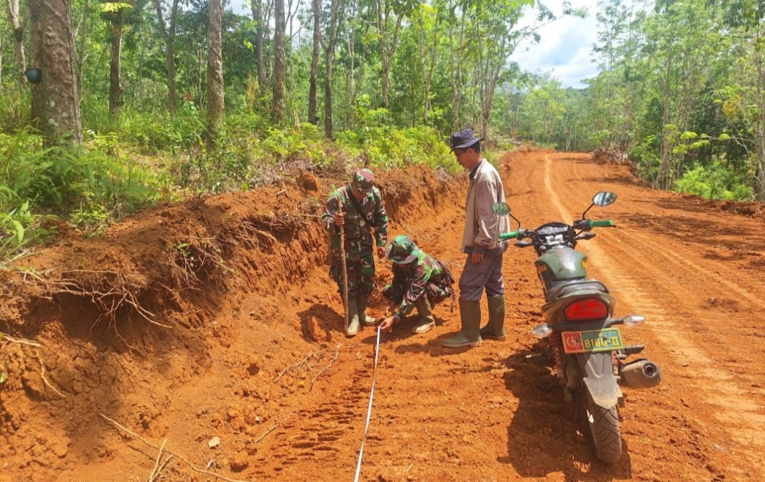 Peltu Teki Sukandi, Koordinator Umum TMMD 122 Kodim 0425/Seluma, turut mendampingi anggota Dinas PU dalam pengukuran jalan dari titik awal hingga titik akhir, termasuk pengukuran lebar badan jalan.