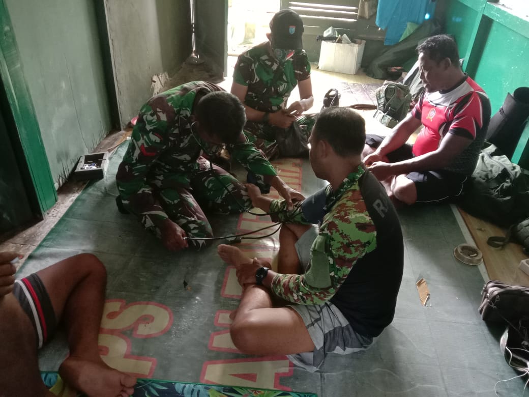 Tampak anggota satgas TMMD membatu Tim Medis melakukan pelayanan kesehatan berupa pengecekan tekanan darah, Senin (05/10/2020).