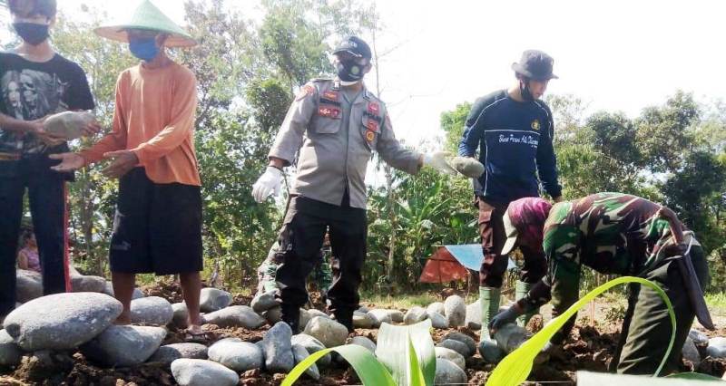 Cuaca Terik, TNI-Polri dan Warga Terus Kebut Talud TMMD Reguler Brebes