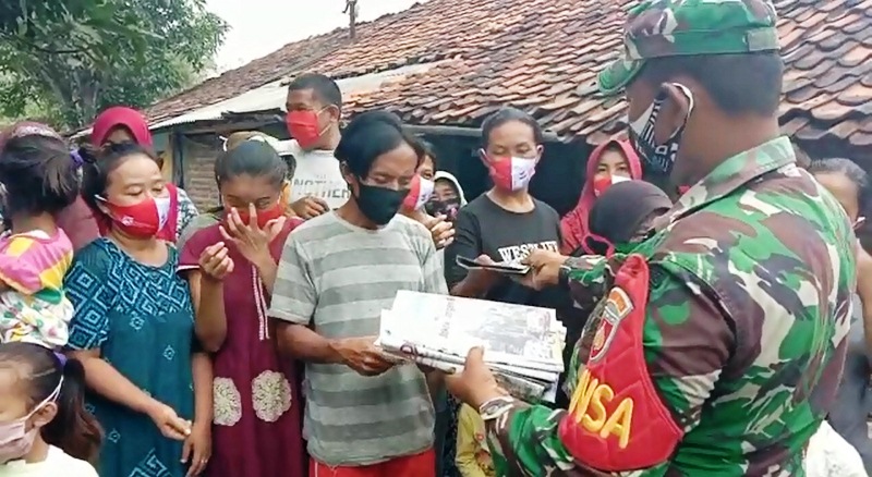 Tampak Babinsa Kalinsu, Koramil 08 Bumiayu, Kodim 0713 Brebes, membagikan puluhan koran kepada warga Dusun Kedung Kandri, Desa Kalinusu, Kecamatan Bumiayu, Kabupaten Brebes, Jawa Tengah. Rabu (30/9/2020).