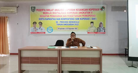 Berandang.com – Bengkulu, Kepala Bidang Pemberdayaan Koperasi, Deddy Erlando, SP, MM, memaparkan berbagai materi pada Diklat Analisis Laporan Keuangan Koperasi Menuju Digitalisasi Koperasi Angkatan II Dalam Kegiatan Pemahaman dan Pengetahuan Perkoperasi serta kapasitas dan Kompetensi SDM Koperasi (DAK) selama empat hari terhitung dari tanggal (26 – 30) di Balai Latihan Koperasi UKM. Selasa (27/09/2022).