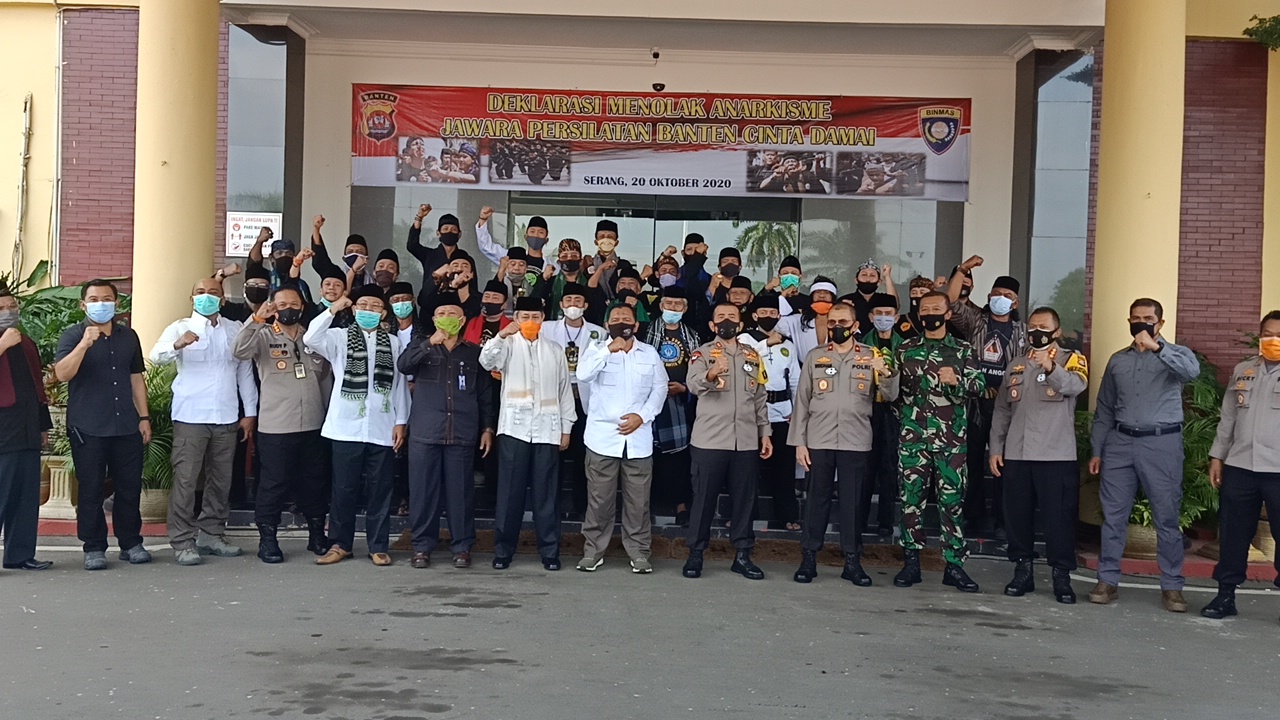 SERANG – Sebanyak 100 Perguruan jawara persilatan Provinsi Banten bersama kepolisian daerah (Polda) Banten dan Korem 064/MY, melakukan kegiatan Deklarasi Cinta Damai menolak tindak anarkis, Banten Cinta Damai di Mapolda Banten, Selasa (20/10/2020) pukul 09.00 WIB