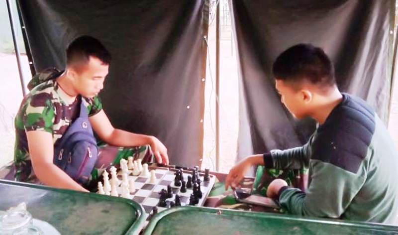 Brebes – Banyak cara yang bisa dilakukan oleh anggota Satgas TMMD Reguler 109 Kodim 0713 Brebes, untuk mengisi waktu istirahat tugas di Desa Kalinusu, Kecamatan Bumiayu, Kabupaten Brebes, Jawa Tengah, selain berinteraksi dengan masyarakat setempat dalam berbagai kegiatan, sebagian kecil bermain catur.
