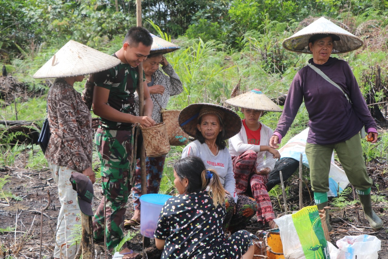 Tampak warga bergotong royong melaksanakan penaman padi secara tradisional di salah satu ladang milik warga setempat. Uniknya lagi sejumlah anggota Satuan Tugas Tentara Manunggal Membangun Desa (TMMD) Reg 109 Kodim 1205/ Sintang turut serta bergotong royong menanam padi.