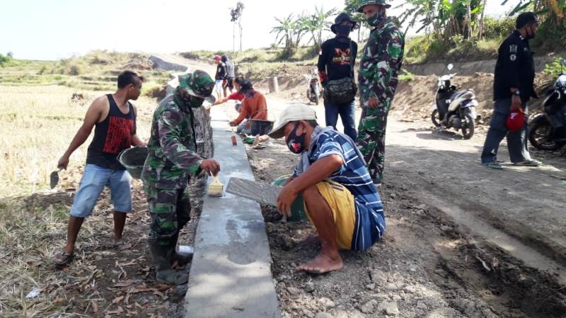 Brebes – Pembangunan talud program TMMD Reguler 109 Kodim 0713 Brebes di Desa Kalinusu, Kecamatan Bumiayu, Kabupaten Brebes, Jawa Tengah, sebagian mulai memasuki tahapan pengacian dinding.