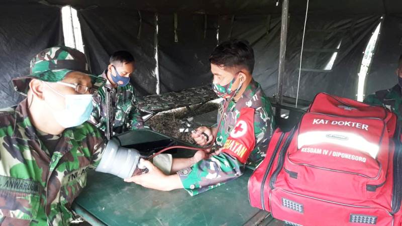 Brebes – Tim Kesehatan Denkesyah 04.04.01 Purwokerto dari Klinik Pratama Kartika 13 Brebes, melakukan pemeriksaan kesehatan secara berkala kepada anggota Satgas TMMD Reguler 109 Kodim 0713 Brebes, di tempat pemusatan tinggal mereka, di tenda-tenda pleton yang didirikan di Lapangan Sepakbola Desa Kalinusu, Kecamatan Bumiayu, Kabupaten Brebes, Jawa Tengah.