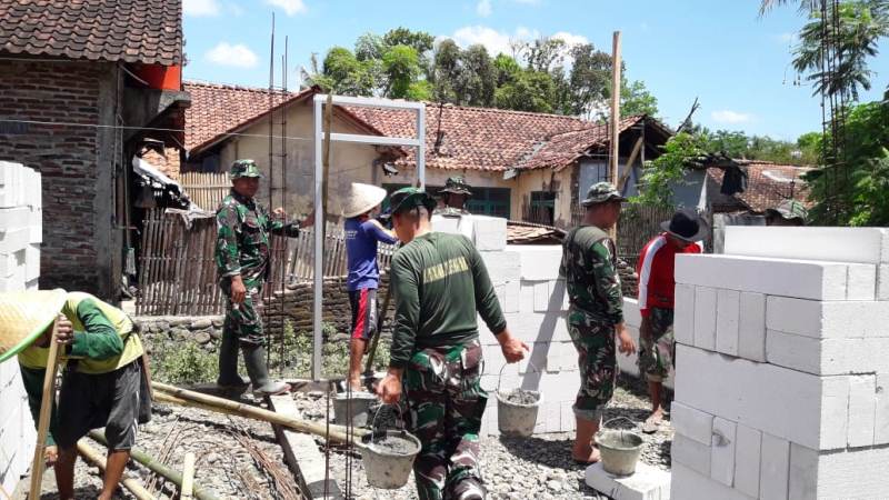 Tampak Danton Satgas TMMD Reguler 109, Lettu Infanteri Sumeri, tidak mau hanya berpangku tangan dan hanya mengawasi anggotanya yang sedang bekerja, namun ikut terjun langsung kerja di pembangunan rumah Makmuri (30), warga Dukuh Karanganyar RT. 02 RW. 01, Kalinusu, bersama masyarakat setempat. Rabu (23/9/2020).